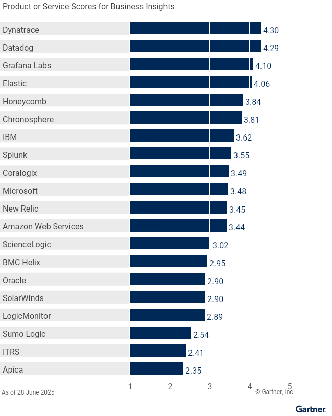 이번 가트너 보고서는 여러 활용 사례(Use Case)를 기준으로 각 솔루션의 핵심 역량을 평가했습니다. Dynatrace는 거의 모든 부문에서 최상위권의 점수를 받으며 그 우수성을 증명했는데요, 특히 주목할 만한 부분은 바로 '실행 가능한 인사이트 생성(Generate Actionable Insights)'과 '사용자 경험 및 비즈니스 분석(User Experience & Business Analysis)' 역량에서 모든 제품 중 가장 높은 평가를 받았다는 점입니다.