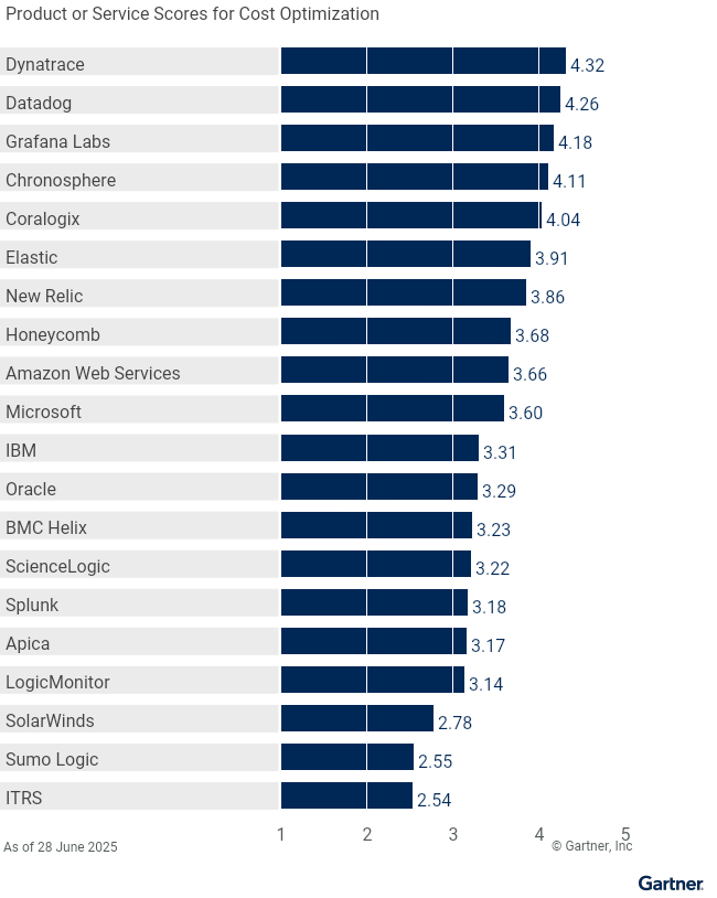 가트너 보고서는 옵저버빌리티 플랫폼 도입 시 비용 관리가 매우 중요하다고 강조합니다. 관리가 제대로 되지 않으면 비용이 통제 불가능하게 증가할 수 있기 때문이죠. Dynatrace는 '비용 최적화' 활용 사례에서도 최상위권의 평가를 받아, 강력한 성능을 제공하면서도 비용 효율성을 관리할 수 있는 역량을 갖췄음을 보여주었습니다.