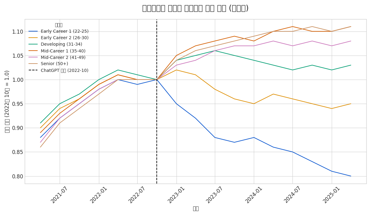 실제 연구에 포함된 '소프트웨어 개발자' 직군의 연령대별 고용 추이 그래프는 위의 이미지를 통해 확인하실 수 있습니다. 2022년 10월(ChatGPT 출시 시점)을 기점으로 사회초년생 그룹(22-25세)의 고용이 급격히 꺾이는 것을 시각적으로 확인하실 수 있습니다.